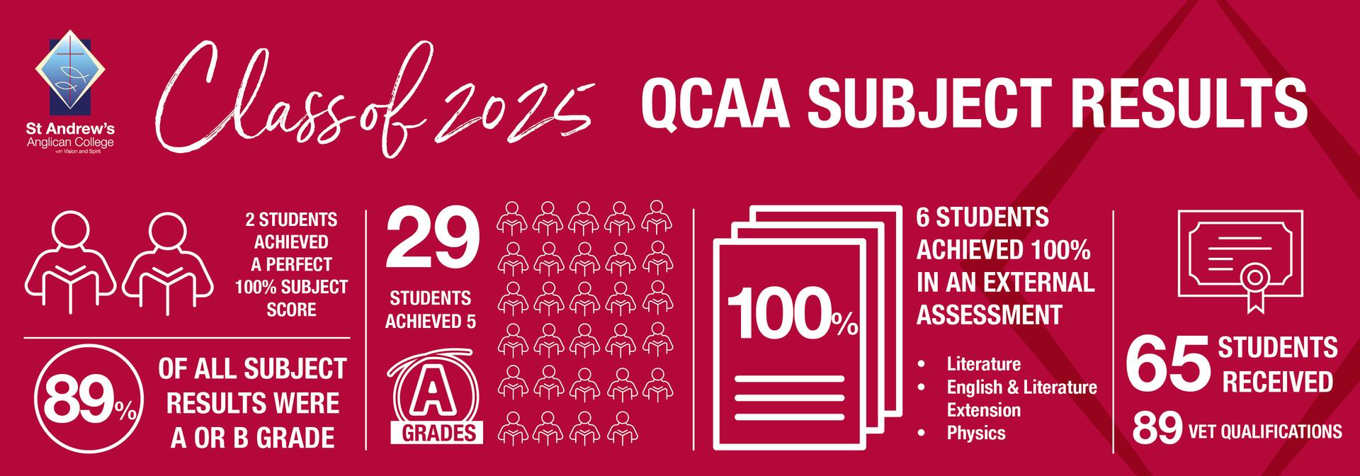 We are delighted to share the final Queensland Curriculum and Assessment Authority (QCAA) subject results for the class of 2025. These exceptional outcomes reflect not only the academic strength of our students, but also their courage in committing to the pursuit of excellence. We also acknowledge the invaluable support of families and the dedication and expertise of our staff who have guided them throughout their learning journey.
